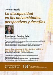 Sandra Katz es Profesora de Educación Física y Licenciada en Psicología. Diplomada en gerencia social y políticas de discapacidad. OEA-FLACSO. Doctoranda en Ciencias Sociales UNLP. Docente, investigadora y extensionista de la UNLP. A cargo de la Dirección de Inclusión y Discapacidad en la Pro Secretaría de DDHH en la UNLP. Coordinadora de la Red Interuniversitaria Latinoamericana y del Caribe sobre Discapacidad y Derechos Humanos, entre otros importantes antecedentes.