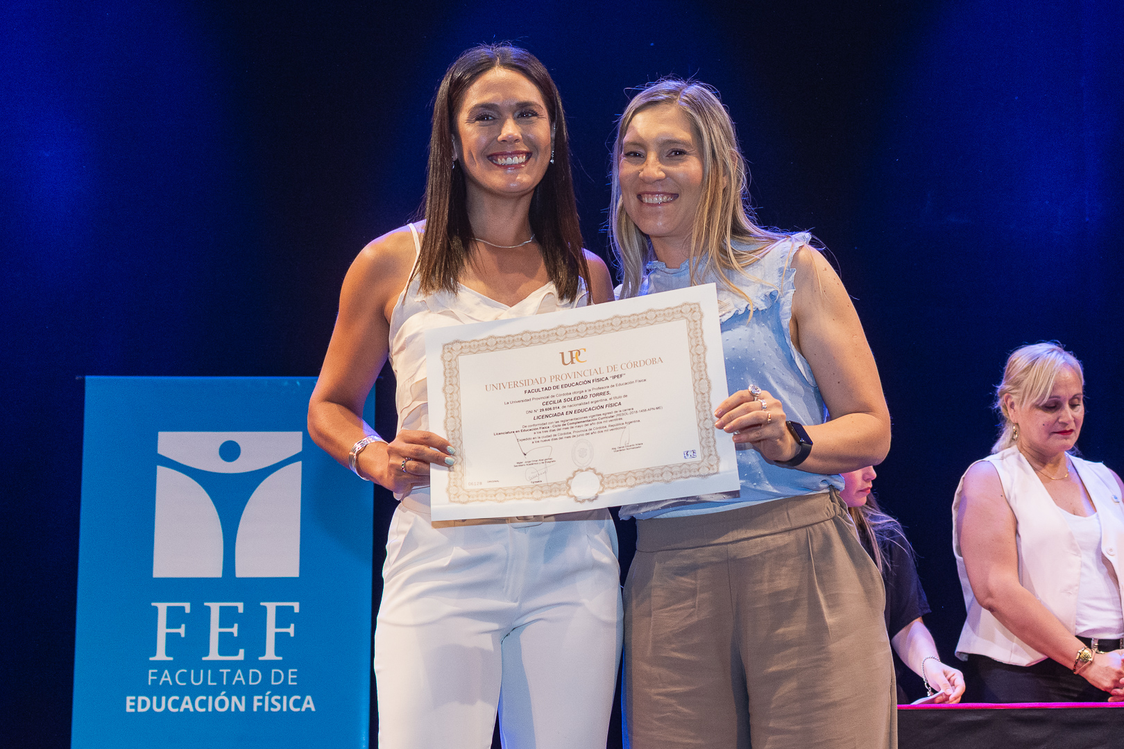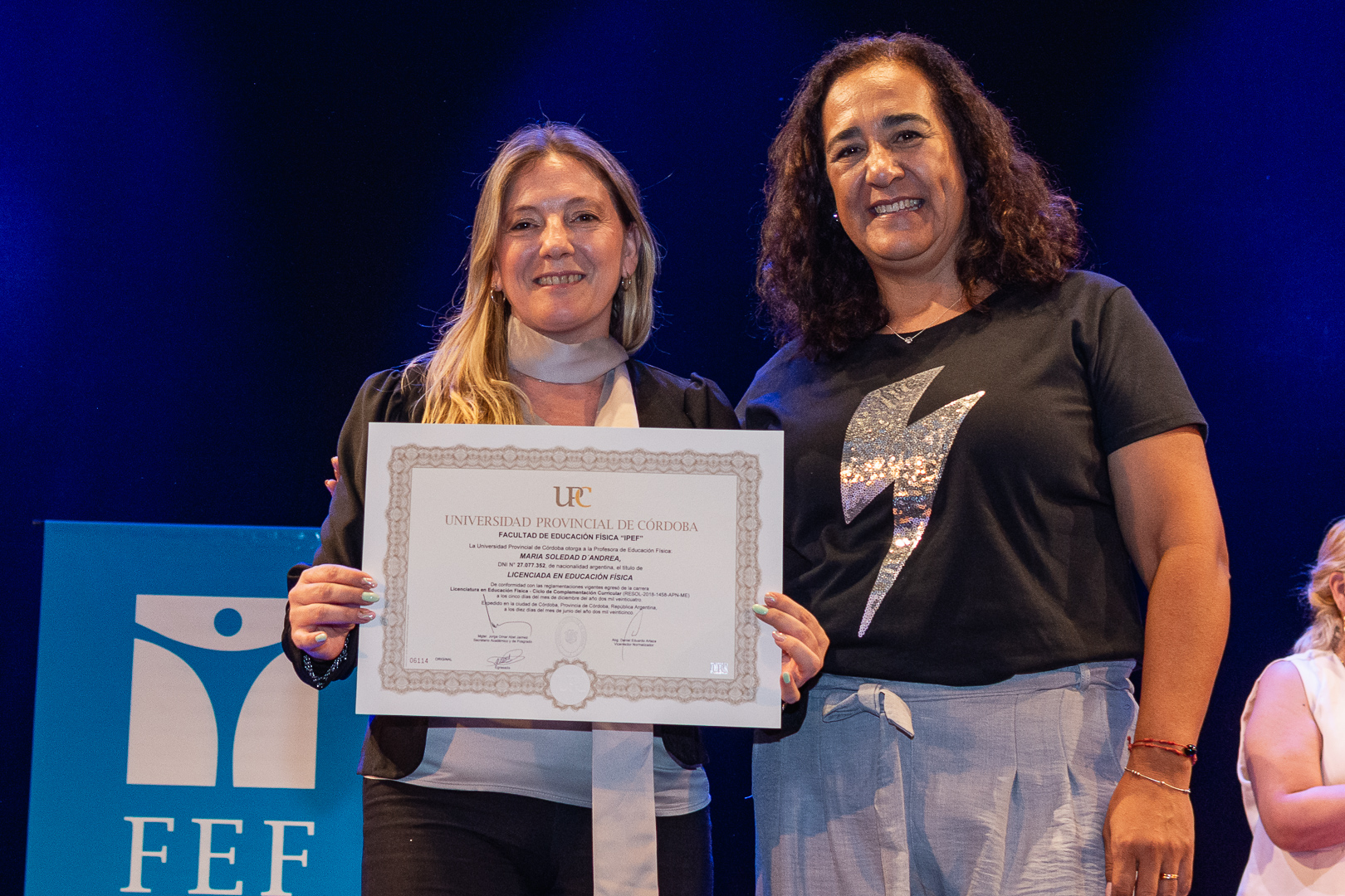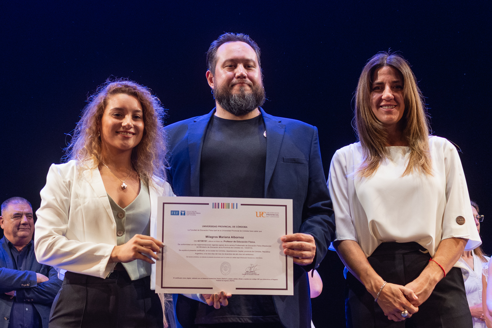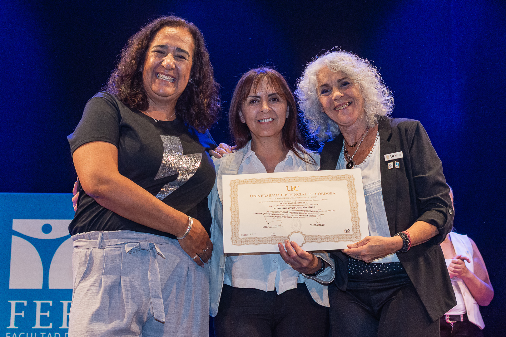 La ceremonia contó con la presencia del secretario de Académica y Posgrado, Jorge Jaimez, además de autoridades, docentes y no docentes de la FEF, representantes del Centro de Estudiantes, miembros de la Unión de Educadores de la Provincia de Córdoba (UEPC), además de familiares que acompañaron con orgullo este importante hito académico.