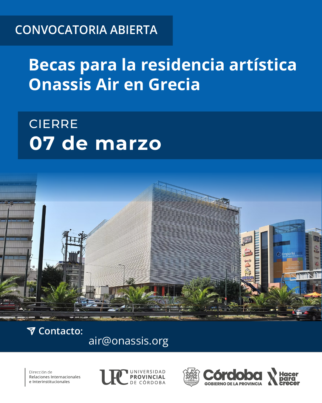 La Universidad Provincial de Córdoba (UPC), a través de su Dirección de Internacionalización, informa que se encuentra abierta la convocatoria a becas de residencia ofrecida por Onassis Air/ONX, una plataforma global dedicada al desarrollo del arte de nuevos medios y al arte inmersivo.