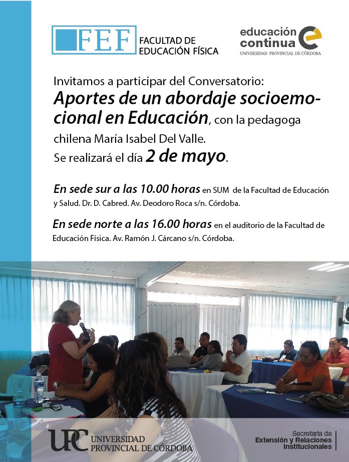 La Facultad de Educación Física de la Universidad Provincial de Córdoba tiene el agrado de invitar al conversatorio Aportes de un abordaje socioemocional en educación, a cargo de la pedagoga chilena María Isabel Del Valle Vergara.