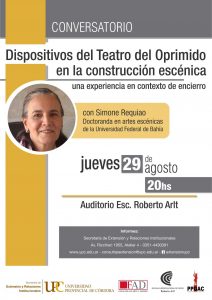 Simone Requiao trabaja desde hace 10 años la técnica del Teatro de los Oprimidos (TO) como un dispositivo de creación escénica “en lugares diversos y adversos”. Su proyecto de investigación se orientó a la dramaturgia creada por mujeres en contexto de encierro, y en su proyecto de doctorado busca – en la misma línea de investigación, ampliar la experiencia en otros contextos y en diferentes países de América Latina.