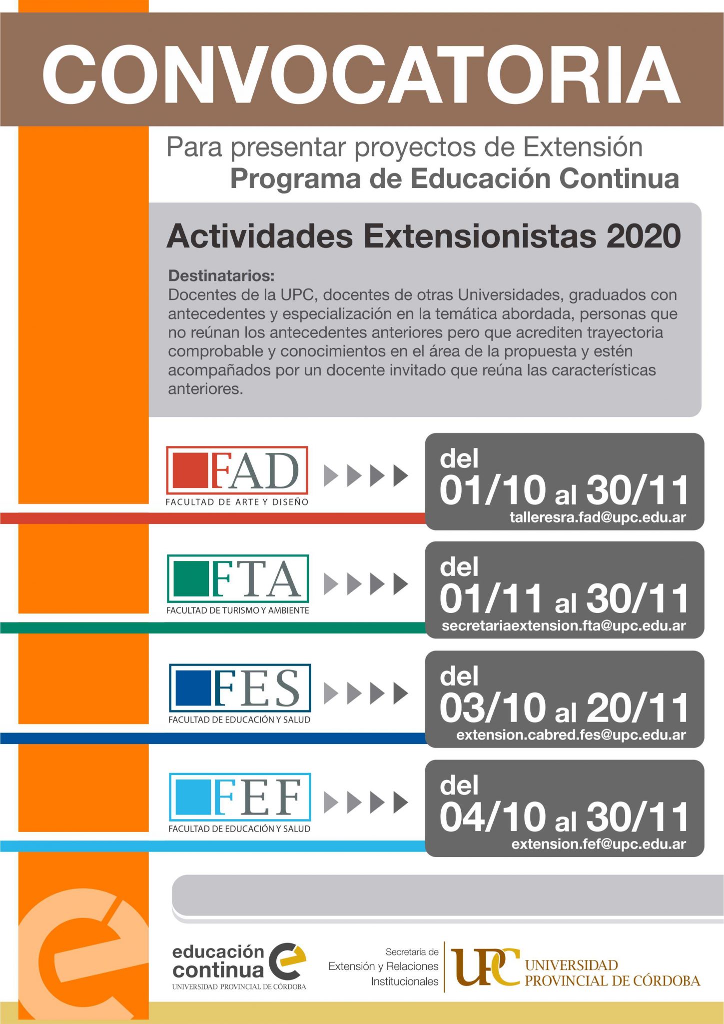 La Secretaría de Extensión y Relaciones Institucionales de la Universidad Provincial de Córdoba informa que se encuentra abierta la Convocatoria para presentar propuestas de Capacitaciones de Extensión Universitaria para el 2020, en el marco del Programa de Educación Continua de la UPC y articulando con las áreas de extensión específicas de cada Facultad.