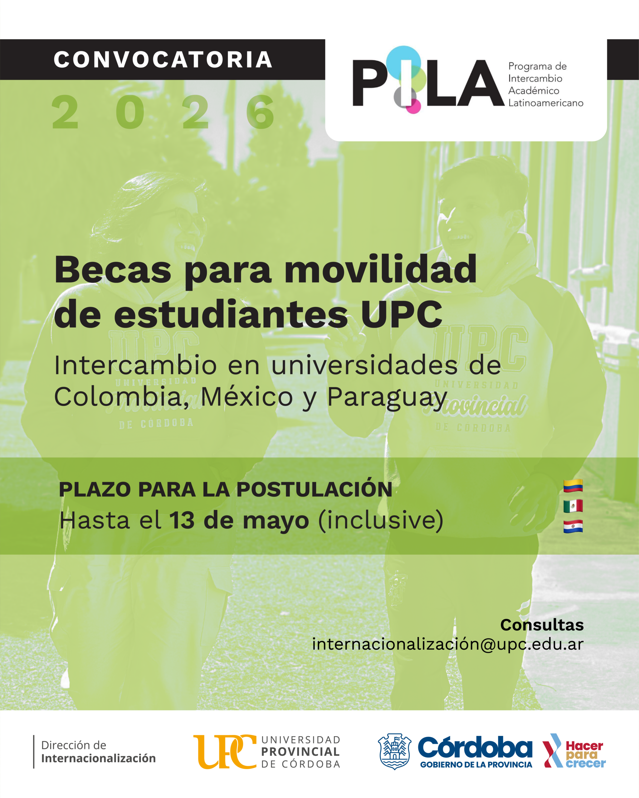 La Universidad Provincial de Córdoba (UPC), a través de su Dirección de Internacionalización y Relaciones Interinstitucionales, abrió la convocatoria para el Programa de Intercambio Académico Latinoamericano (PILA) 2026-2, destinada a estudiantes de carreras de grado que deseen realizar una experiencia académica en el exterior.