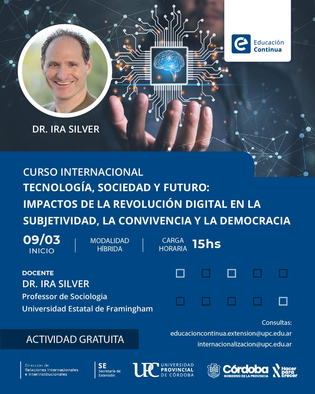 La Universidad Provincial de Córdoba (UPC), a través de su Secretaría de Extensión y su Dirección de Internacionalización, invitan a la comunidad educativa y al público general a inscribirse en el curso internacional «Tecnología, sociedad y futuro», a cargo del docente invitado, profesor de Sociología en la Universidad Estatal de Framinghan (Estados Unidos), Dr. Ira Silver.