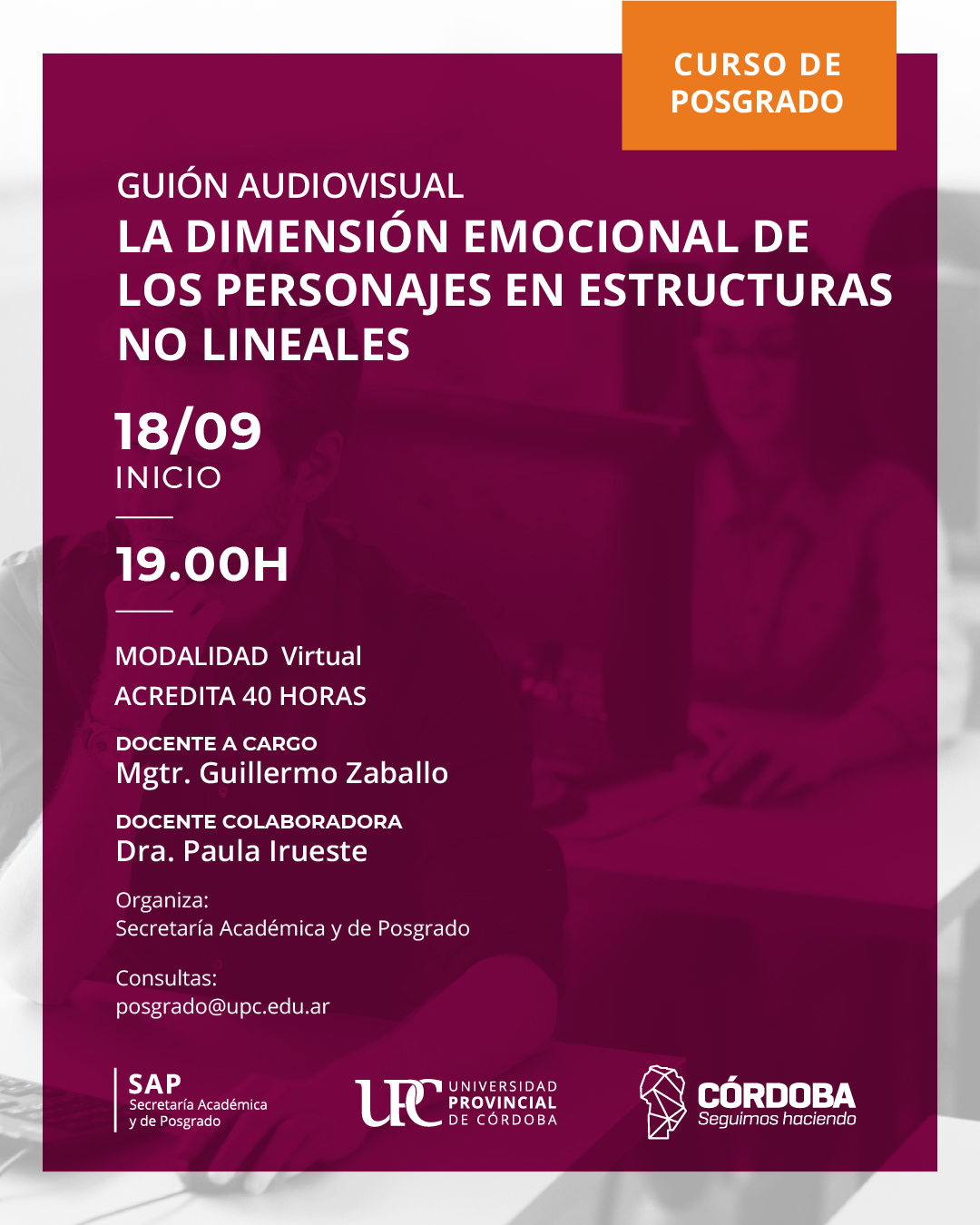 La Universidad Provincial de Córdoba (UPC), a través de su Secretaría Académica y de Posgrado, invita a participar del curso de posgrado “Guión audiovisual: La dimensión emocional de los personajes en estructuras no lineales”.