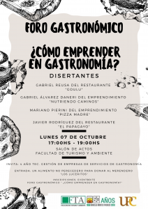 El Foro Gastronómico: ¿Cómo emprender en la gastronomía? se realizará el día lunes 7 de octubre de 17 a 19, en el salón de actos de la Facultad de Turismo y Ambiente (Av. Ramón J. Cárcano 3590).