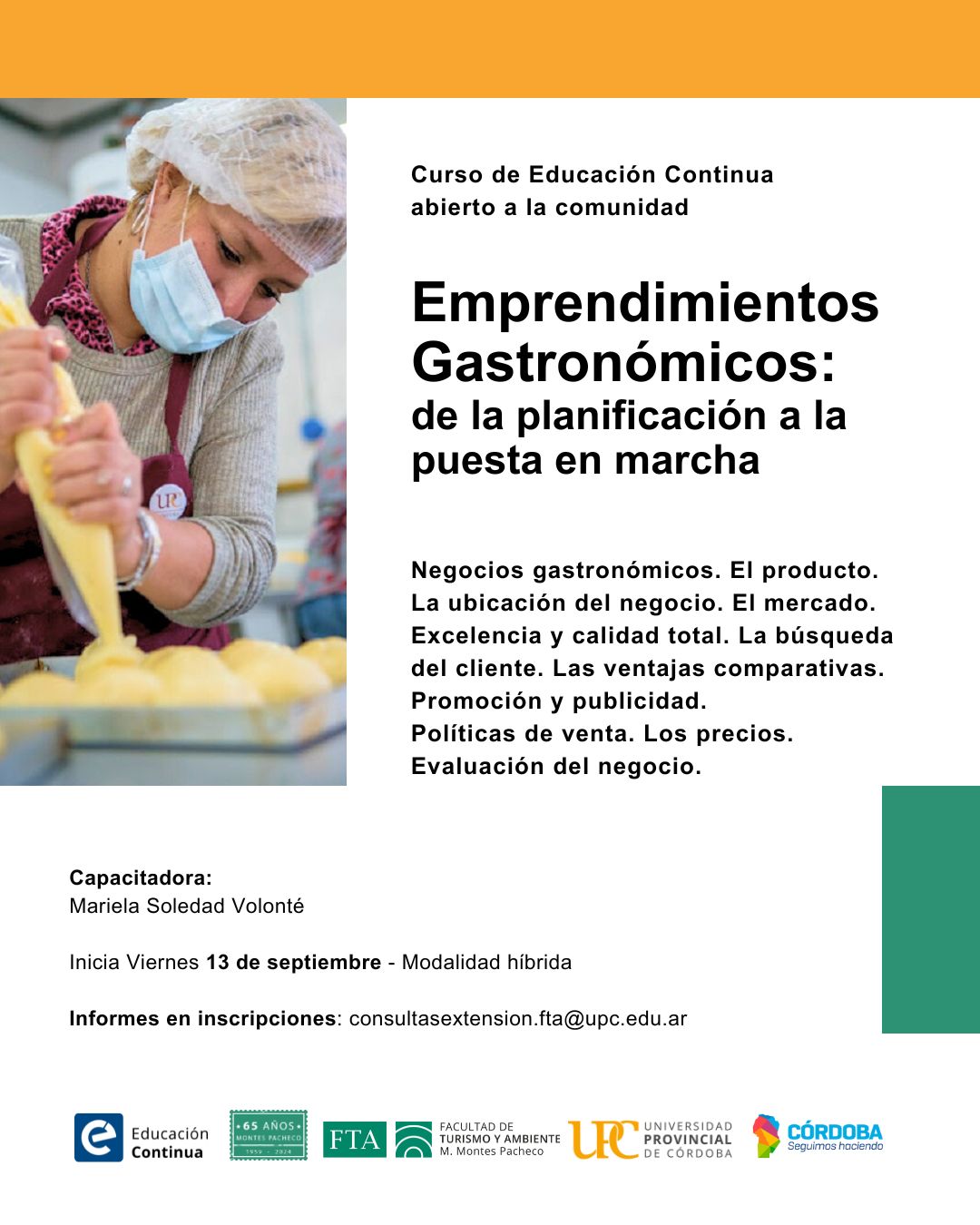 Abordará las siguientes temáticas: Negocios gastronómicos. El producto. La ubicación del negocio. El mercado. Excelencia y calidad total. La búsqueda del cliente. Las ventajas comparativas. Promoción y publicidad. Políticas de venta. Los precios. Y Evaluación del negocio.