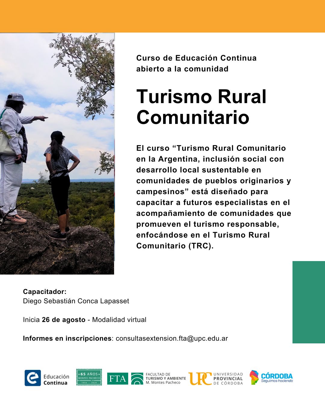 El curso virtual “Turismo Rural Comunitario en la Argentina, inclusión social con desarrollo local sustentable en comunidades de pueblos originarios y campesinos” está diseñado para capacitar a futuros especialistas en el acompañamiento de comunidades que promueven el turismo responsable, enfocándose en el Turismo Rural Comunitario (TRC). Se cubrirán conceptos, herramientas de gestión y estudios de casos exitosos en Argentina y el mundo.