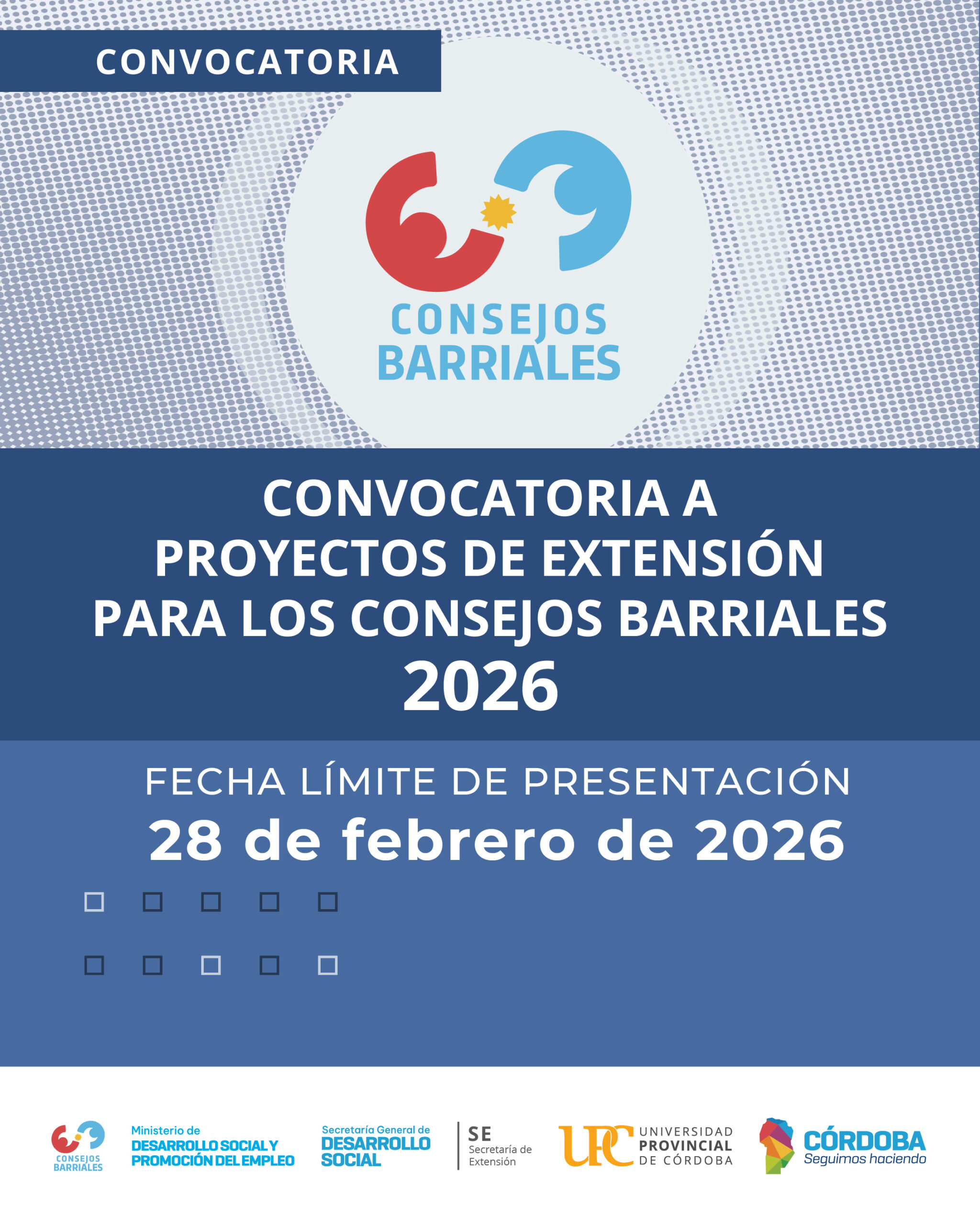 La Universidad Provincial de Córdoba, a través de su Secretaría de Extensión, abrió la Convocatoria 2026 de Proyectos de Extensión para los Consejos Barriales, una iniciativa orientada a fortalecer el compromiso social de la Universidad y profundizar su vinculación transformadora con la comunidad.