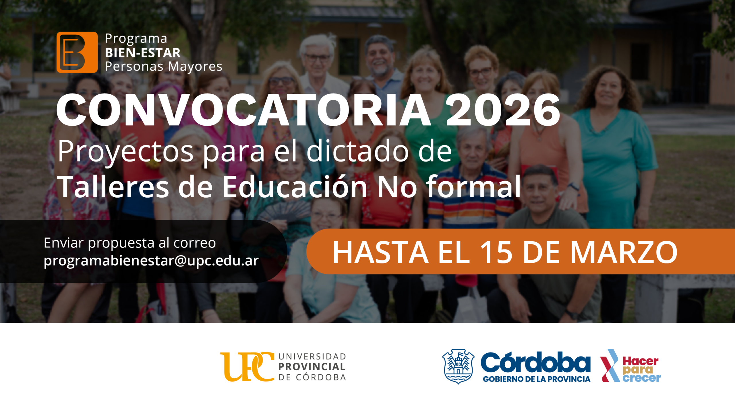 La Universidad Provincial de Córdoba abrió la convocatoria para presentar proyectos de talleres de educación no formal que formarán parte del Programa Transversal Universitario BIEN–ESTAR para Personas Mayores, destinado a personas a partir de los 55 años.