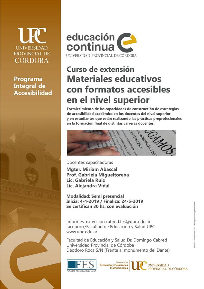 La Universidad Provincial de Córdoba informa que se prorrogó la fecha  de inscripción al curso de extensión semipresencial Materiales educativos con formatos accesibles en el nivel superior.