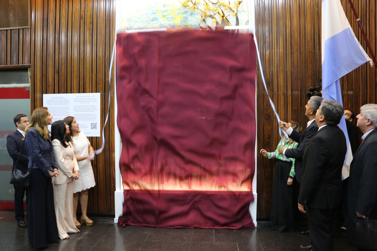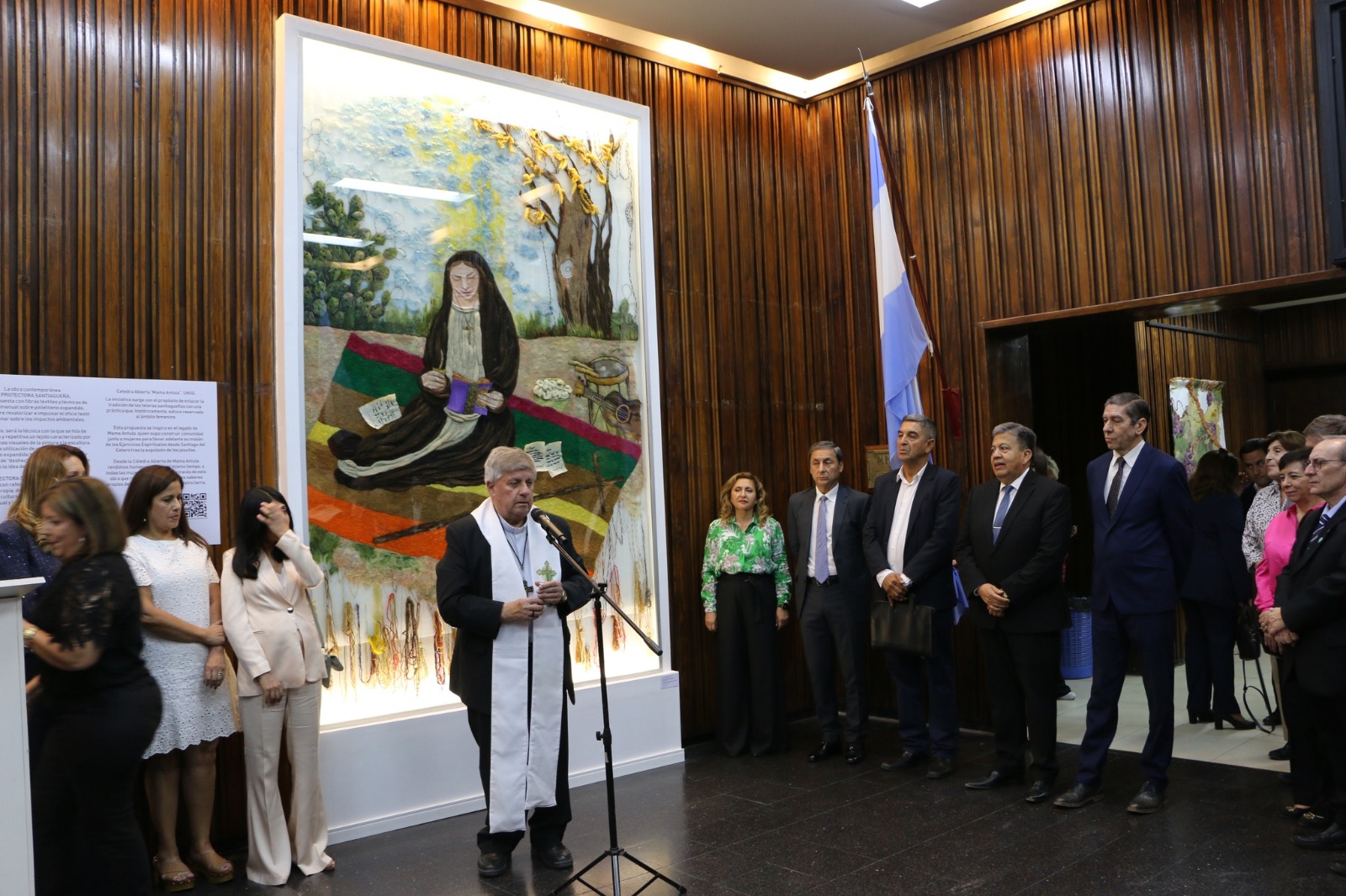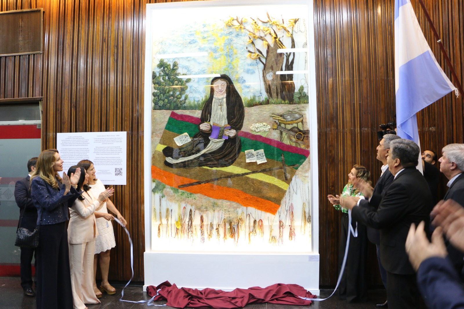Durante la jornada se presentó el mural textil comunitario “Mama Antula y el saber ancestral”, una obra colectiva realizada por la artista visual Gabriela Beatriz Soria, en conjunto con la Asociación Civil Teleras de Majada Sud y la Cooperativa Teleras Atamisqueñas.