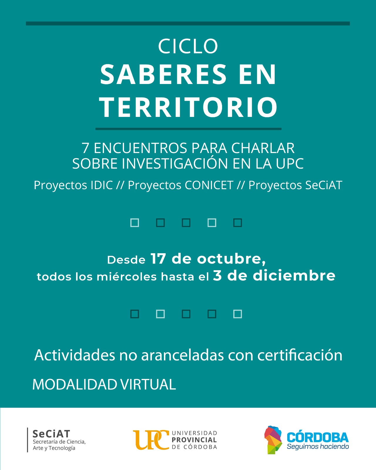 El próximo miércoles 29 de octubre, de 18 a 20 h, se realizará el segundo encuentro del ciclo Saberes en Territorio, una propuesta impulsada por la Secretaría de Ciencia, Arte y Tecnología de la Universidad Provincial de Córdoba.