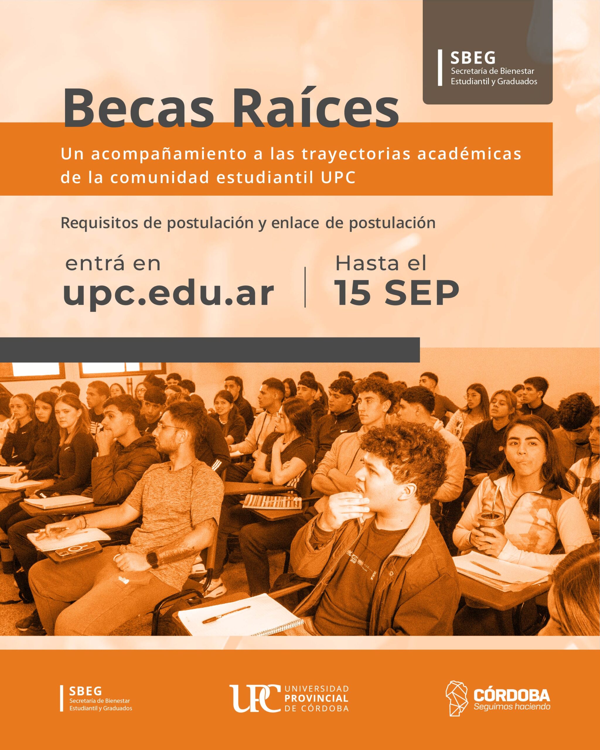 Hasta el día lunes 15 de septiembre inclusive estarán abiertas las preinscripciones a las “Becas Raíces – Ayuda Económica UPC”, impulsadas por la Universidad Provincial de Córdoba, a través de su Secretaría de Bienestar Estudiantil y Graduados.